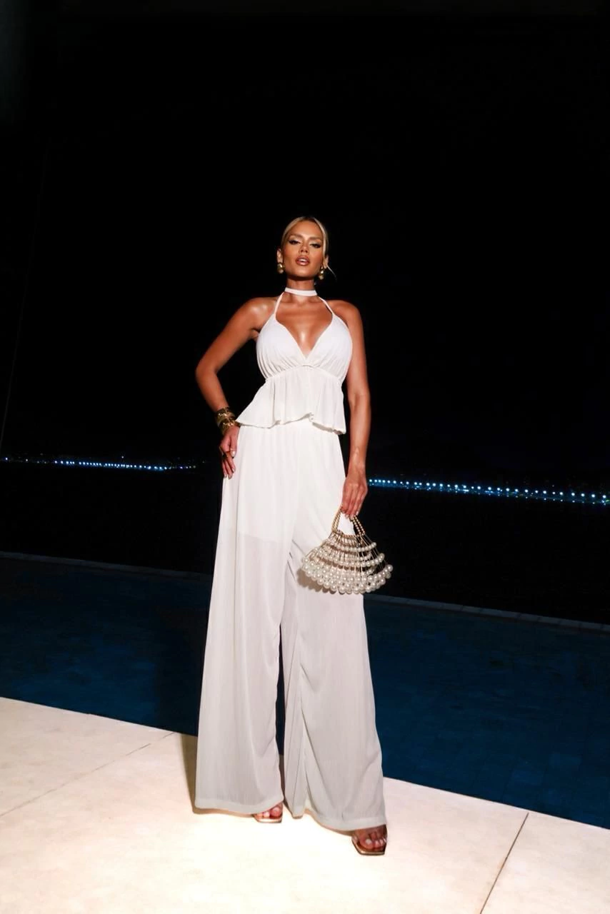 Conjunto feminino elegante composto por blusa e calça pantalona em tecido plissado leve, com caimento fluido e toque macio. O top possui decote em “V”, amarração no pescoço estilo halter e leve babado peplum que valoriza a cintura. A calça apresenta cintura alta com cós confortável e pernas amplas que alongam a silhueta, garantindo movimento e sofisticação.