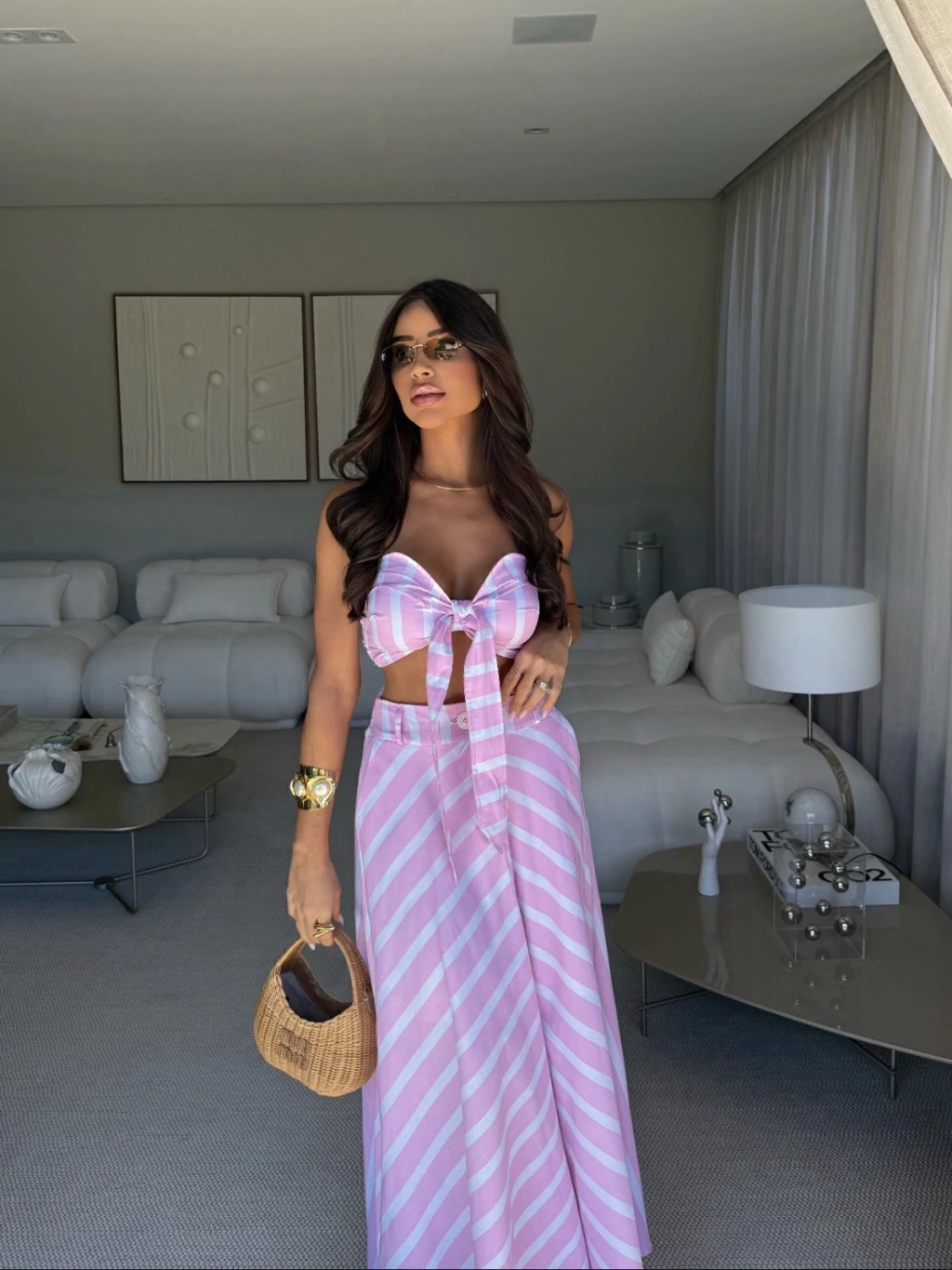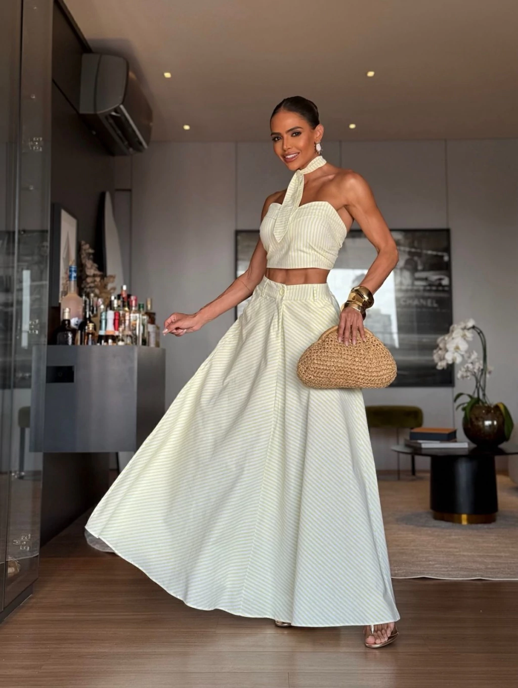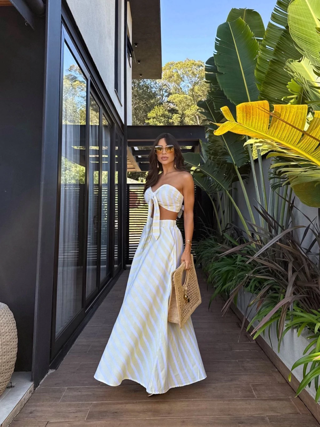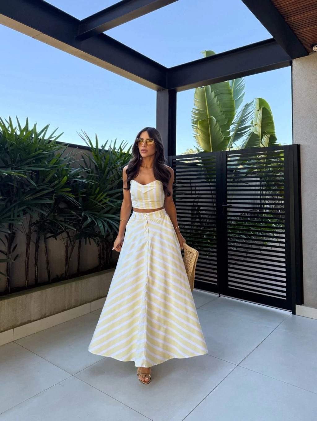 O Conjunto Florença une frescor e sofisticação em um look atemporal. Confeccionado em tricoline 100% algodão, entrega toque macio, estrutura leve e caimento impecável. O top estilo bustiê com nó central valoriza o colo, enquanto a saia longa de cintura alta e listras diagonais alonga a silhueta com movimento elegante.