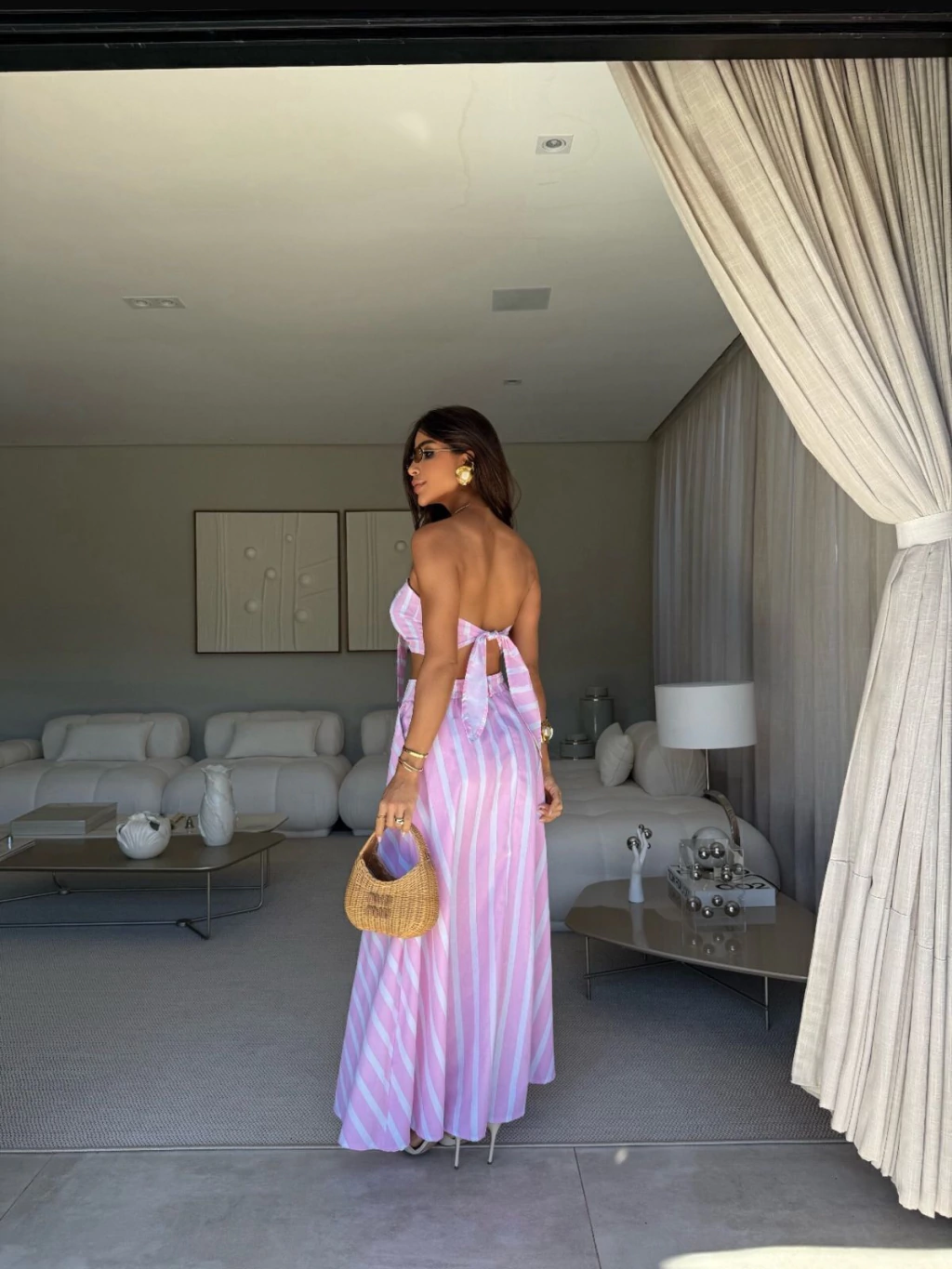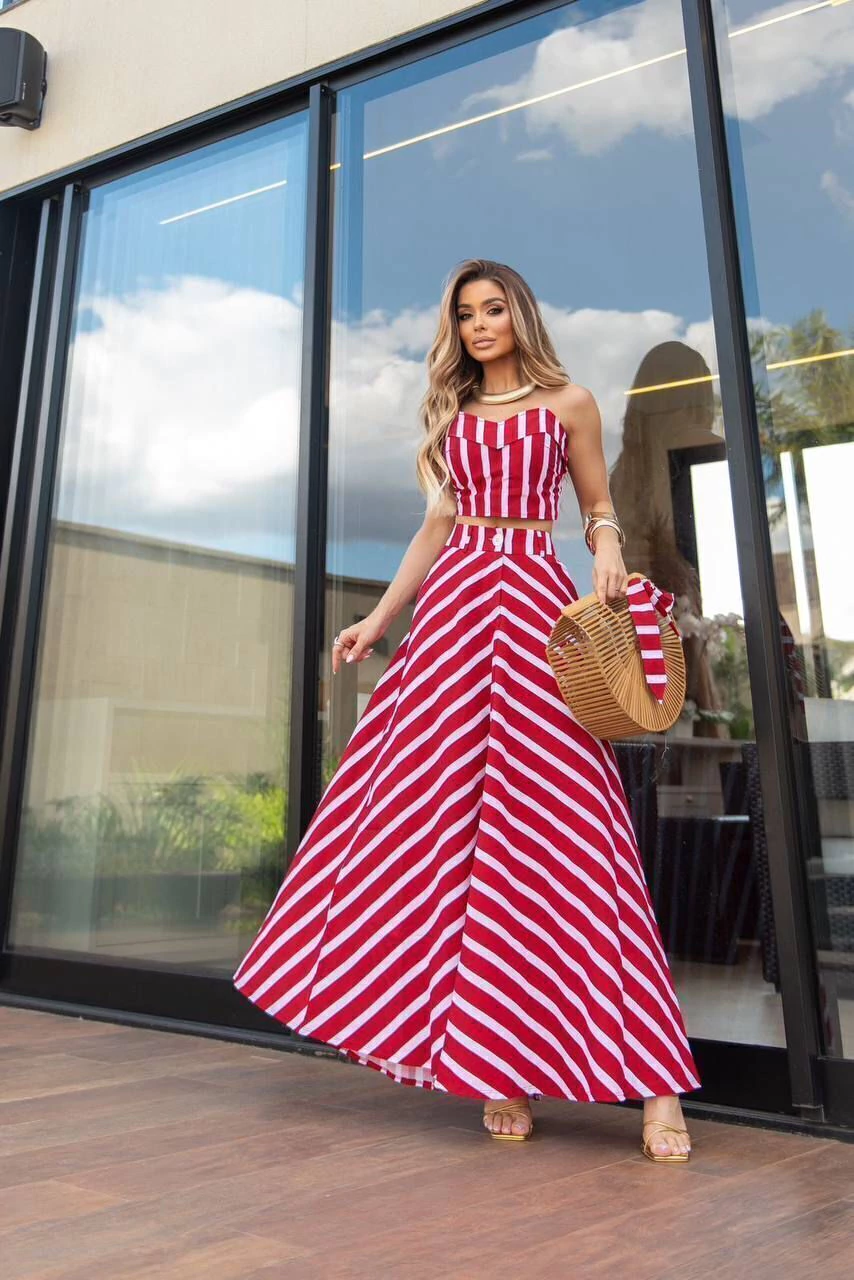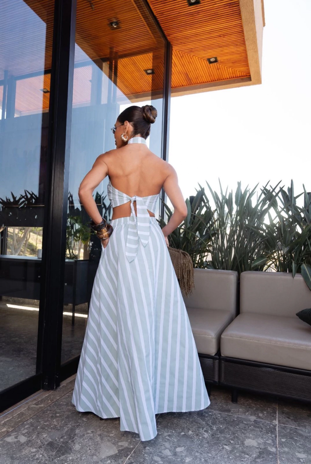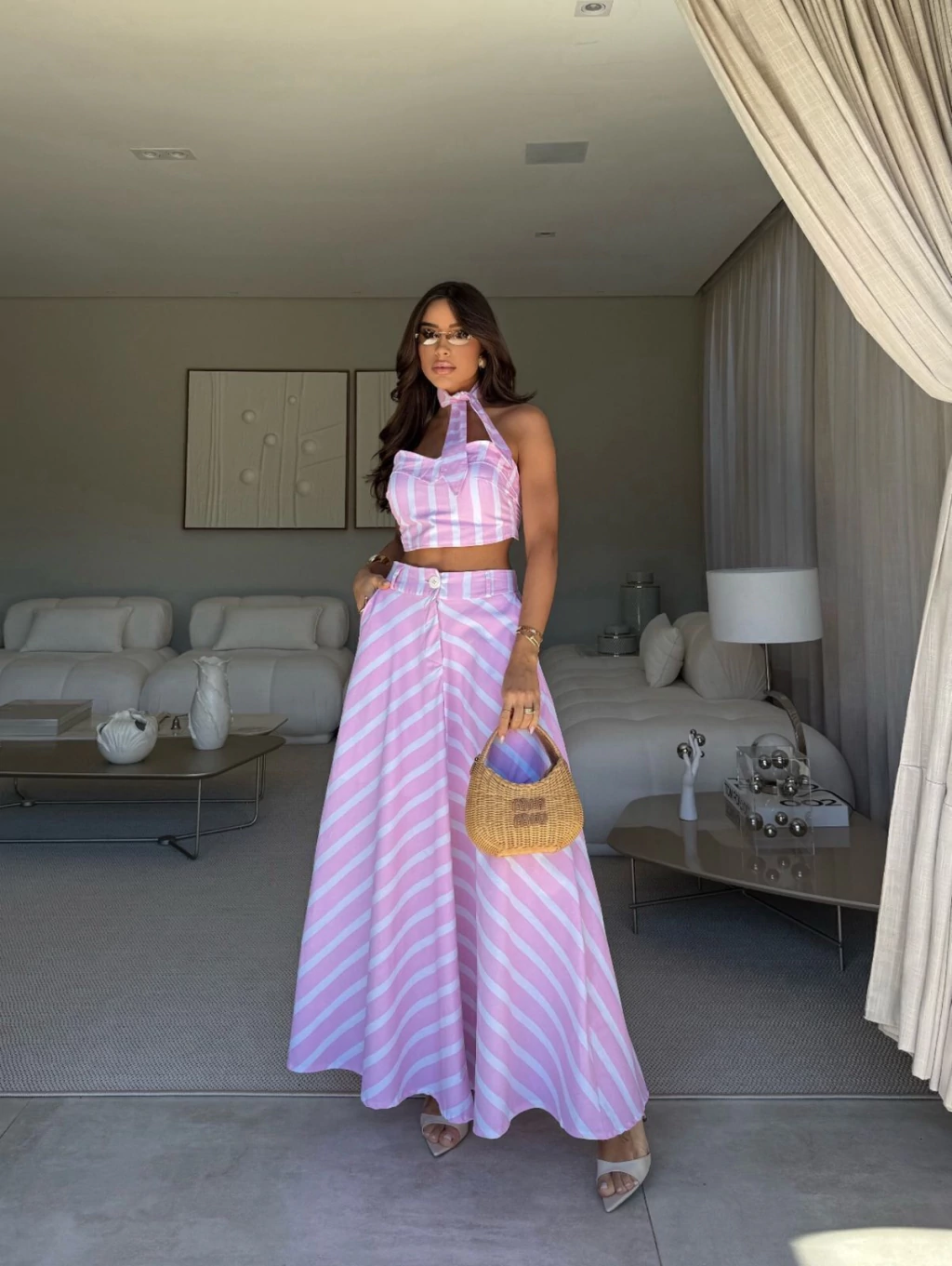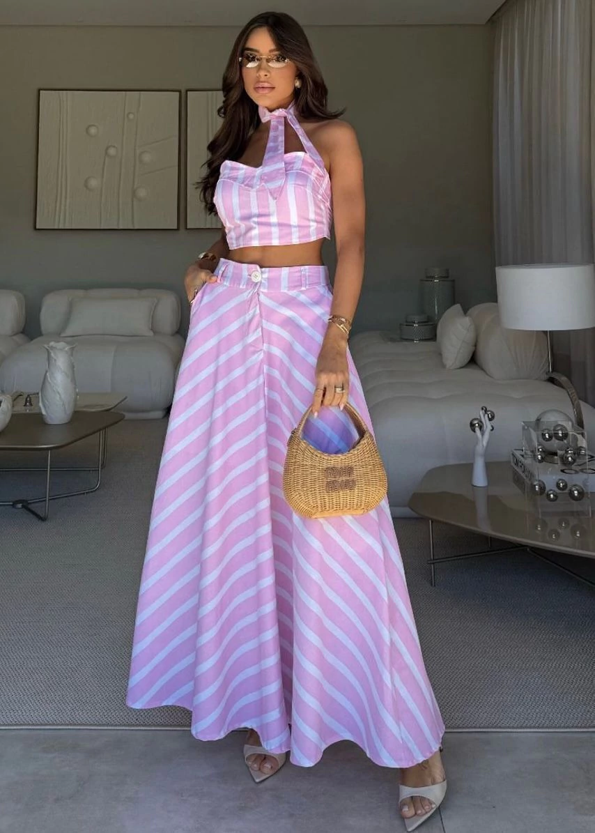 O Conjunto Florença une frescor e sofisticação em um look atemporal. Confeccionado em tricoline 100% algodão, entrega toque macio, estrutura leve e caimento impecável. O top estilo bustiê com nó central valoriza o colo, enquanto a saia longa de cintura alta e listras diagonais alonga a silhueta com movimento elegante.