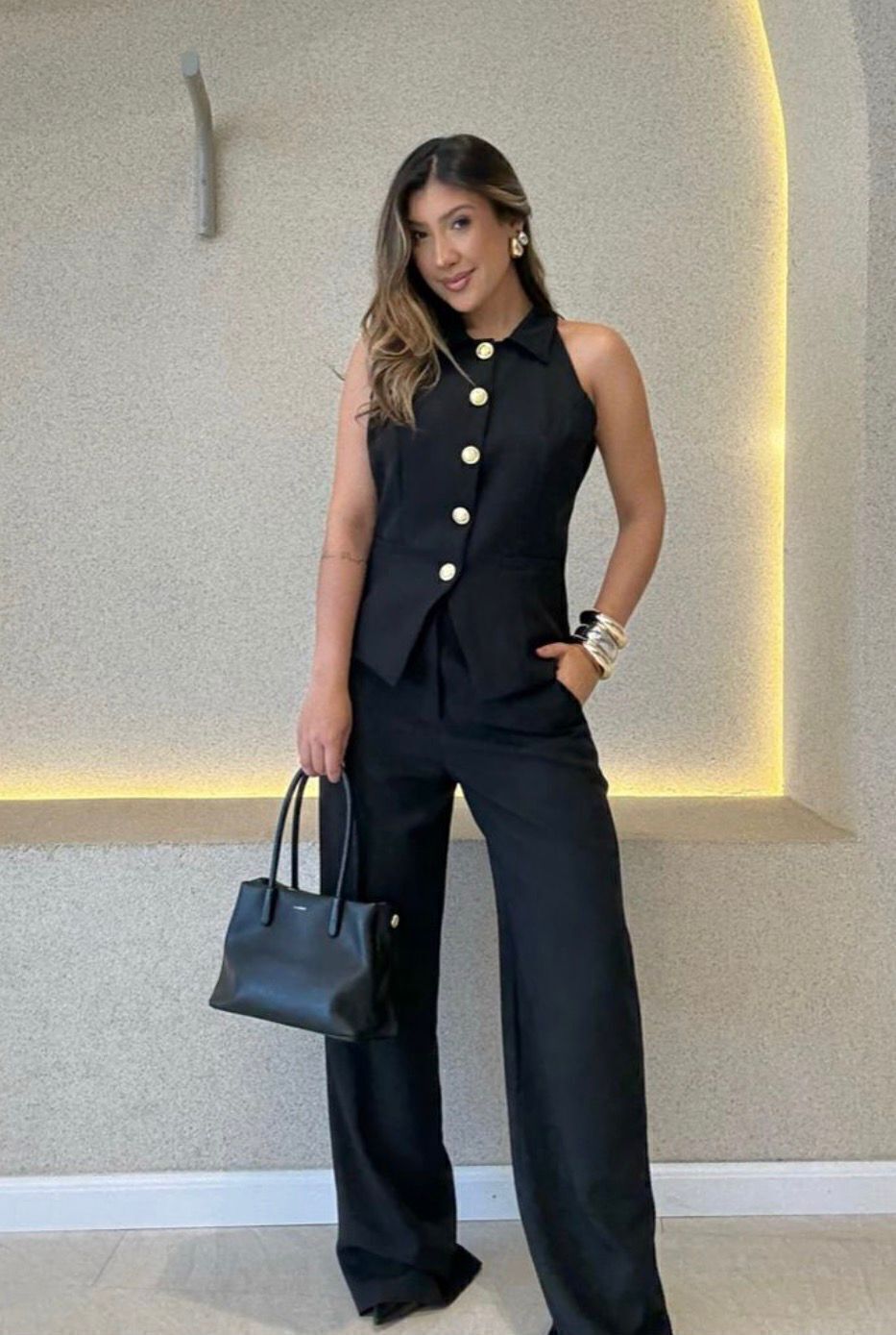 Confeccionado em tecido encorpado de alta qualidade, o conjunto é composto por um colete estruturado e uma calça reta que juntos formam uma produção sofisticada e funcional. O colete apresenta gola clássica, recorte acinturado e fechamento frontal com botões dourados imponentes, que agregam charme e requinte à peça. Os bolsos decorativos reforçam a estética elegante e enriquecem o visual.