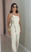 A modelagem moderna conta com blusa estruturada de alças finas, detalhe assimétrico frontal e botões dourados, que trazem sofisticação e estilo. A calça de alfaiataria possui corte reto e zíper invisível nas costas, proporcionando conforto e um visual elegante.