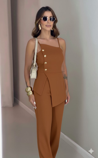 A modelagem moderna conta com blusa estruturada de alças finas, detalhe assimétrico frontal e botões dourados, que trazem sofisticação e estilo. A calça de alfaiataria possui corte reto e zíper invisível nas costas, proporcionando conforto e um visual elegante.