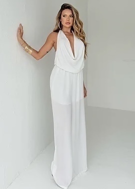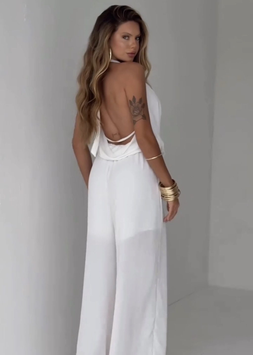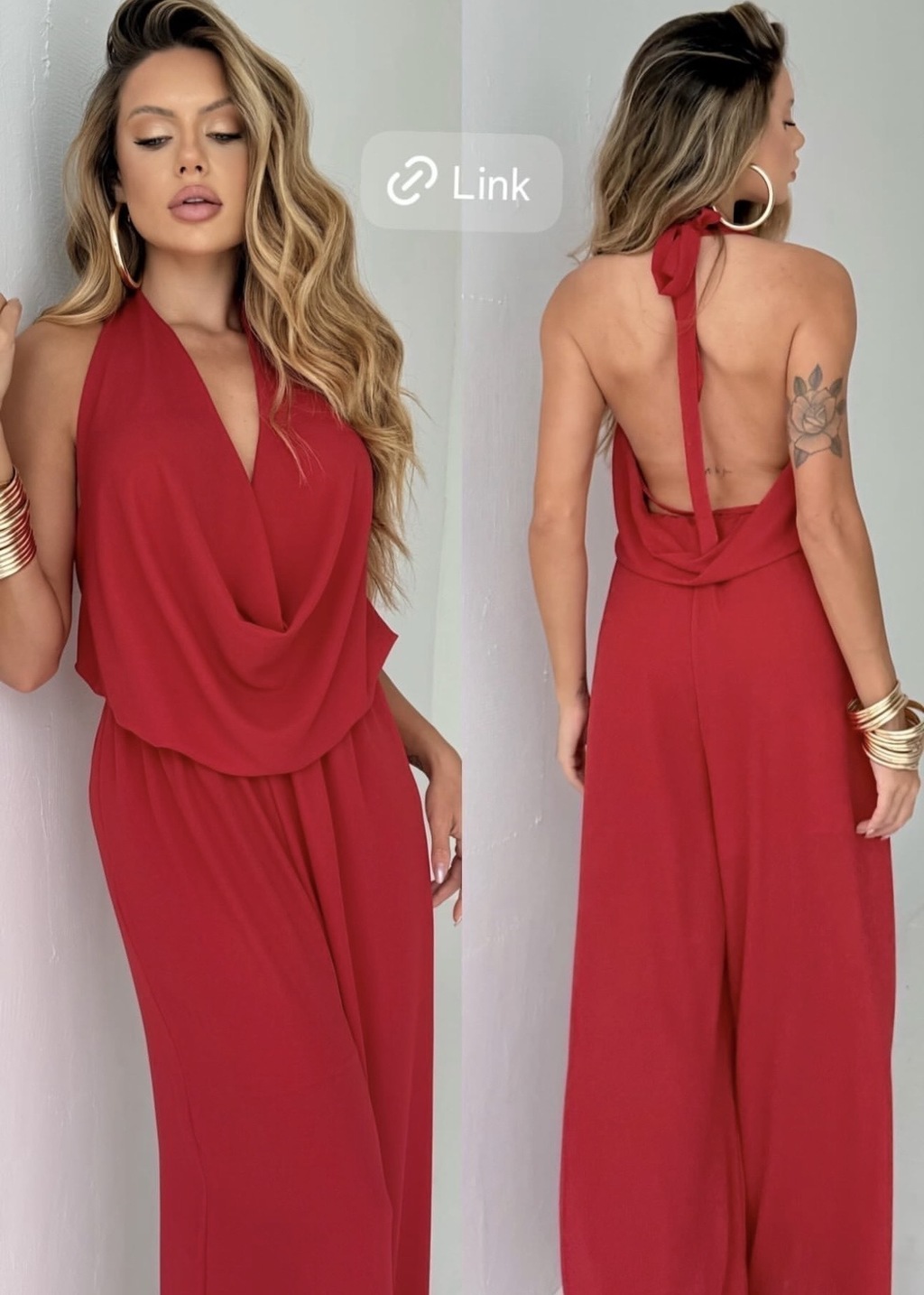 O Macacão Luna une sofisticação e leveza em uma peça única de caimento fluido. Em Crepe GGT, destaca-se pelo decote drapeado profundo (efeito cowl) e pelas costas abertas com amarração, que valorizam a silhueta e garantem ajuste confortável. A perna ampla cria movimento elegante, ideal para eventos, jantares e produções noturnas.