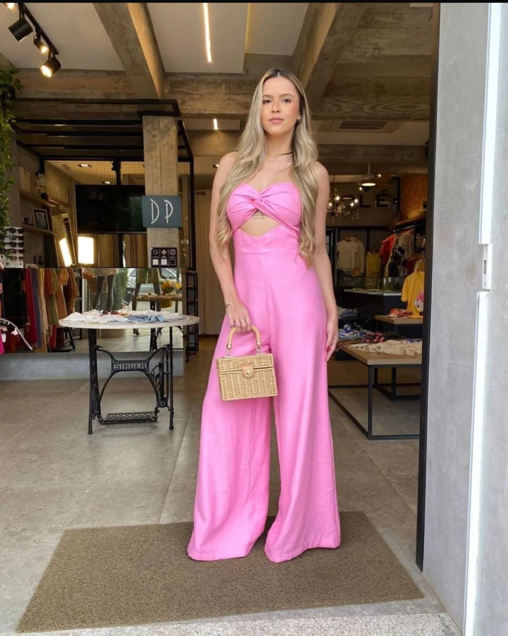 Macacão tomara-que-caia em tecido Marrant, encorpado e com ótimo caimento. Busto com torção central e recorte em gota que valoriza o colo. Cintura marcada e perna wide leg (ampla) garantindo movimento elegante e alongamento da silhueta. Costas abertas com amarração tipo laço, permitindo melhor ajuste ao corpo.