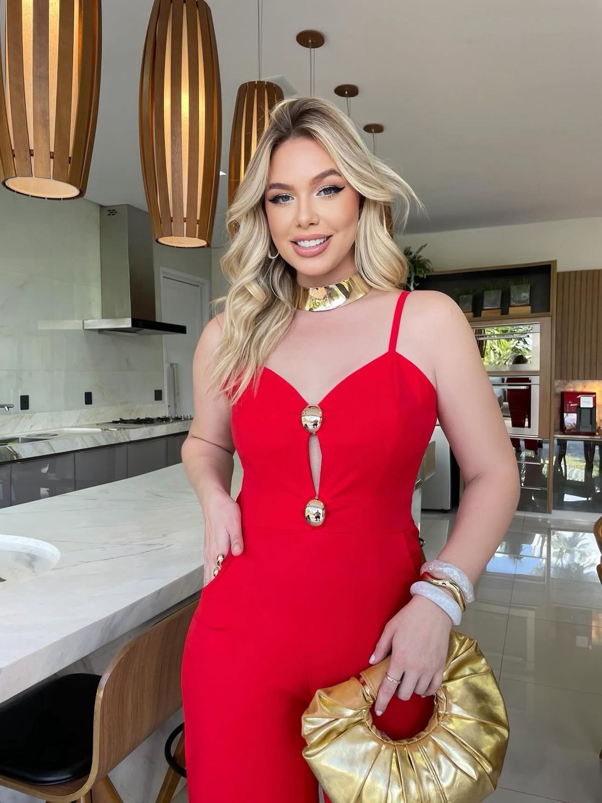 O modelo possui decote em V mais delicado, recorte frontal com abertura e duas fivelas quadradas em metal, que deixam o macacão ainda mais diferenciado. A calça tem modelagem pantalona, cintura alta e caimento solto, trazendo alongamento visual e muito conforto ao vestir.