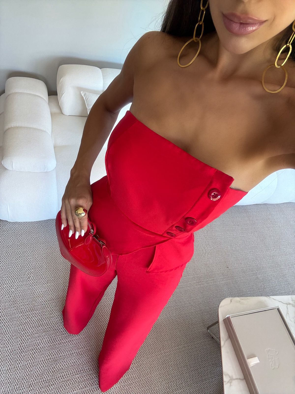 Sua modelagem tomara que caia possui recorte assimétrico com botões decorativos, trazendo charme e exclusividade ao visual. A pala frontal estruturada cria um efeito de cintura marcada, enquanto a calça pantalona alonga e proporciona movimento fluido, garantindo um look elegante para qualquer ocasião.