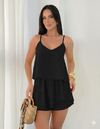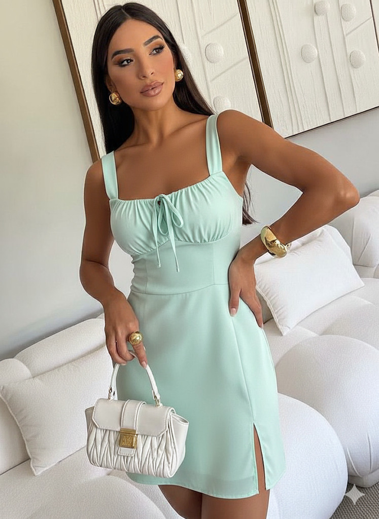 O Macaquinho Dany une charme e conforto em um caimento curto e acinturado. Confeccionado em tecido Dunas (leve e com textura sofisticada), traz alças largas, decote reto com franzido e amarração no busto e costas com amarração trançada para ajuste perfeito. A fenda discreta na barra finaliza com um toque moderno.