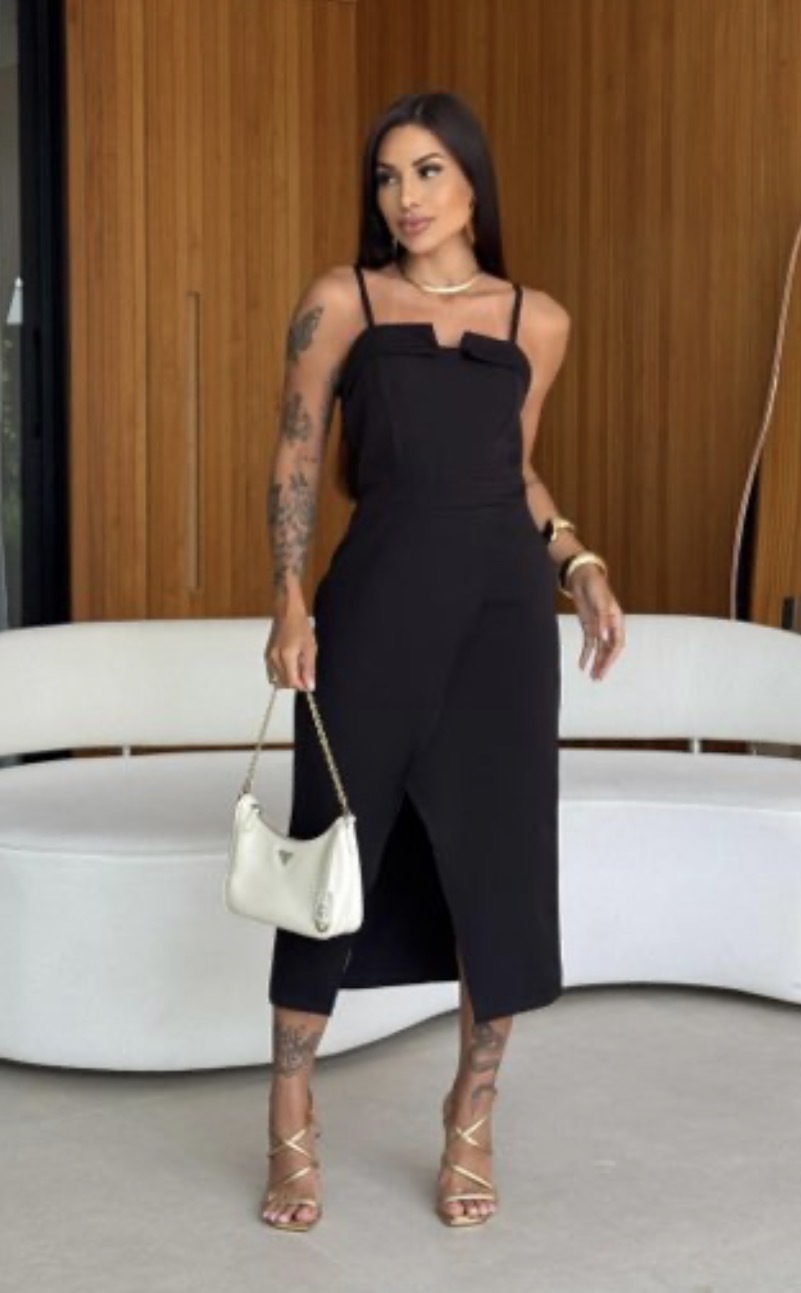 Elegante e atemporal, o Vestido Escarlate valoriza a silhueta com modelagem lápis, comprimento midi e fenda frontal. O decote reto com leve recorte e as alças finas trazem sofisticação, — ideal para eventos, jantares e ocasiões especiais.
