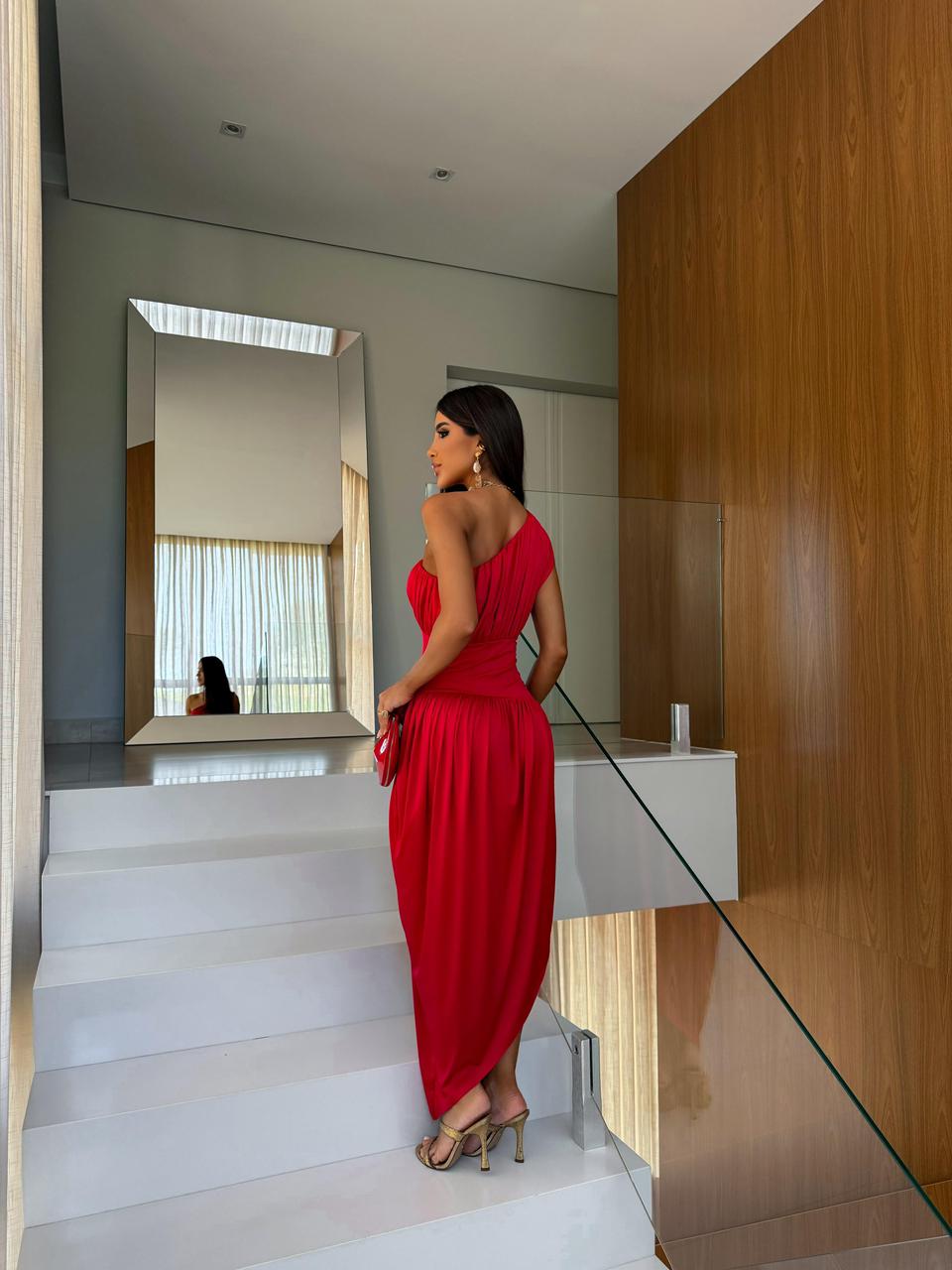 Confeccionado em tecido Fluity, o vestido possui toque macio, caimento leve e excelente elasticidade, proporcionando conforto e ajuste perfeito ao corpo. O modelo de um ombro só traz modernidade e elegância, enquanto a cintura marcada realça as curvas de forma delicada e feminina. A saia longa com movimento garante leveza e sofisticação, criando um visual imponente e atemporal.