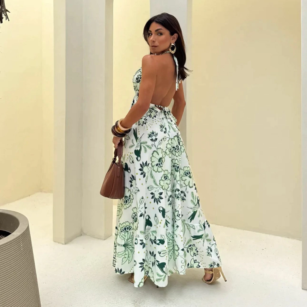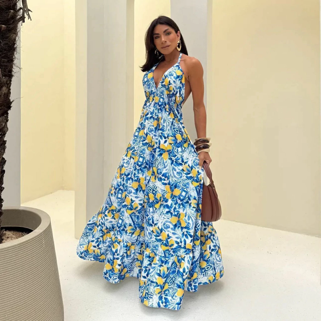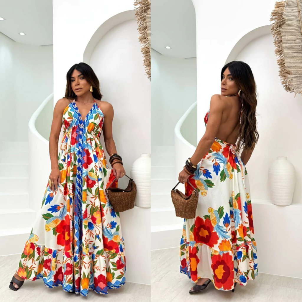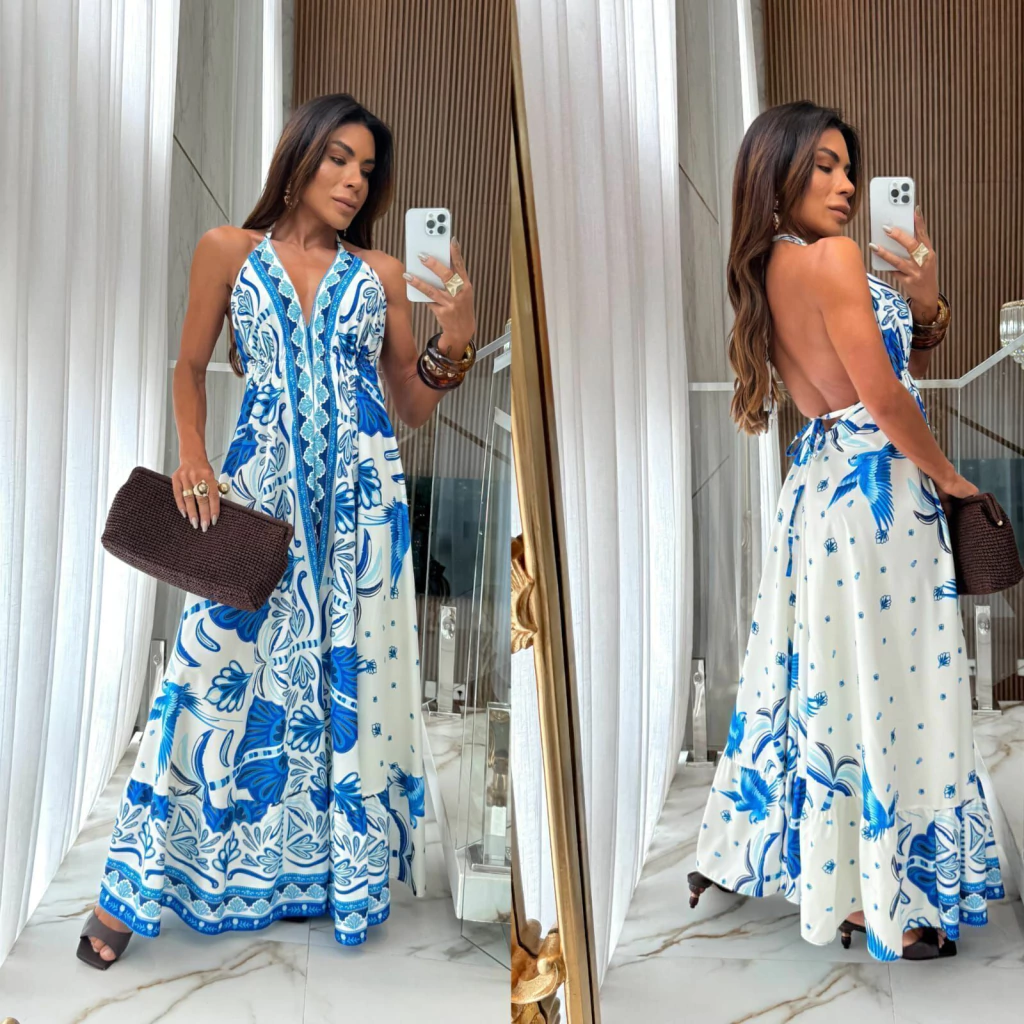 • Alças: estilo halter com amarração no pescoço e ajuste nas costas