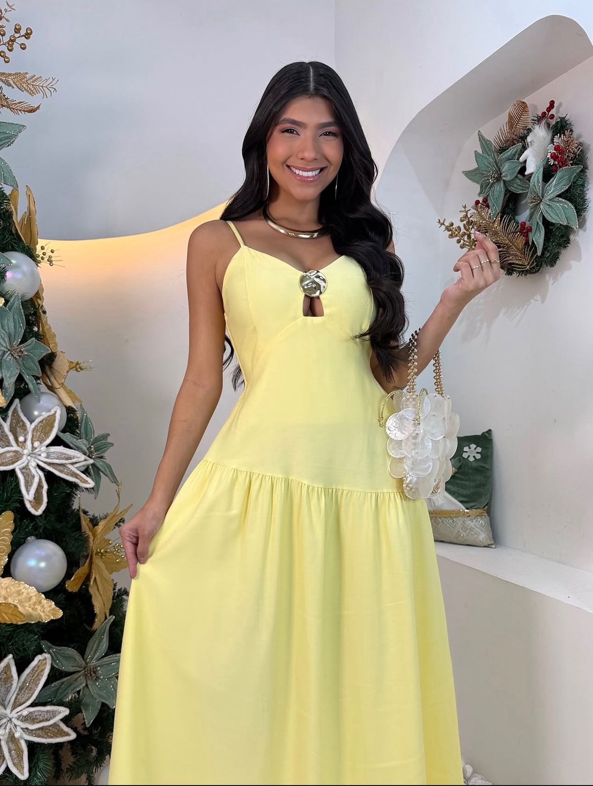 Vestido Stefany em tecido marrant, com caimento leve e fluido, ideal para compor looks elegantes nas festas de fim de ano e em ocasiões especiais. O modelo possui alças finas, decote arredondado com detalhe em argola metálica na frente e pequena abertura que valoriza o colo com sofisticação. A saia longa com recorte na altura do quadril cria volume suave e movimento, garantindo conforto ao caminhar. As costas em lastex proporcionam melhor ajuste ao corpo e vestibilidade perfeita no tamanho único M.